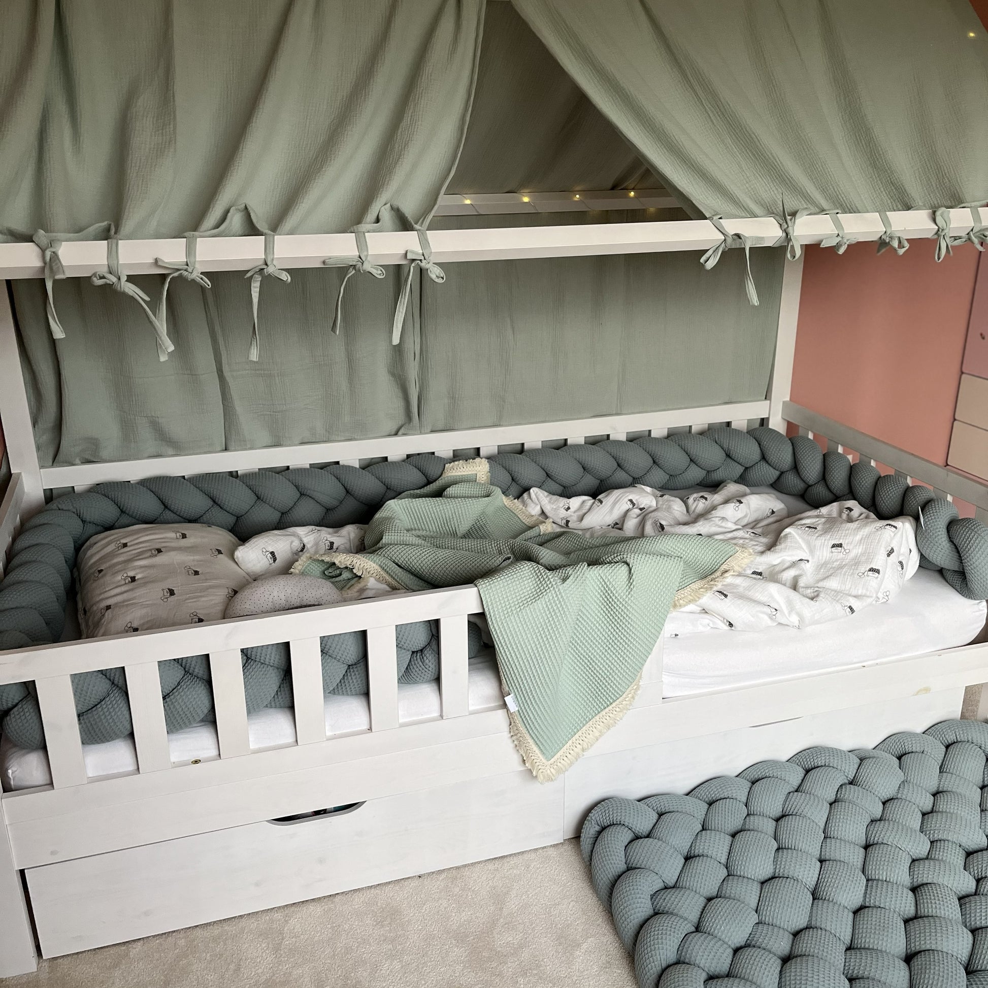 Unsere geflochtene Bettschlange entsteht in liebevoller Handarbeit in Deutschland. Jede Bettschlange ist ein kleines Einzelstück und schützt dein Baby zuverlässig vor harten Bettkanten oder Gitterstäben.