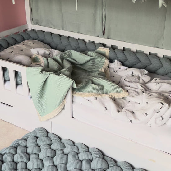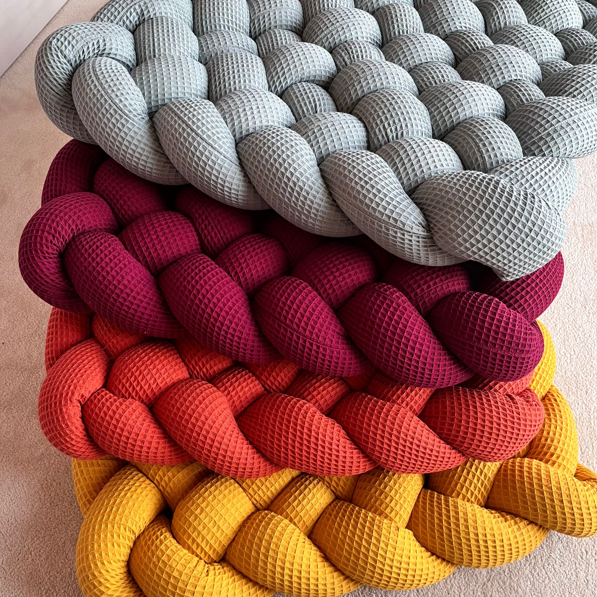 Jedes Stück wird in liebevoller Handarbeit in unserem Atelier in Unterfranken gefertigt. Das weiche, voluminöse Flechtdesign sorgt für ein unvergleichlich angenehmes Laufgefühl und ist zugleich ein echter Blickfang. Der Teppich eignet sich ideal vor dem Kinderbett, im Spielbereich oder als dekoratives Element im Familienraum.